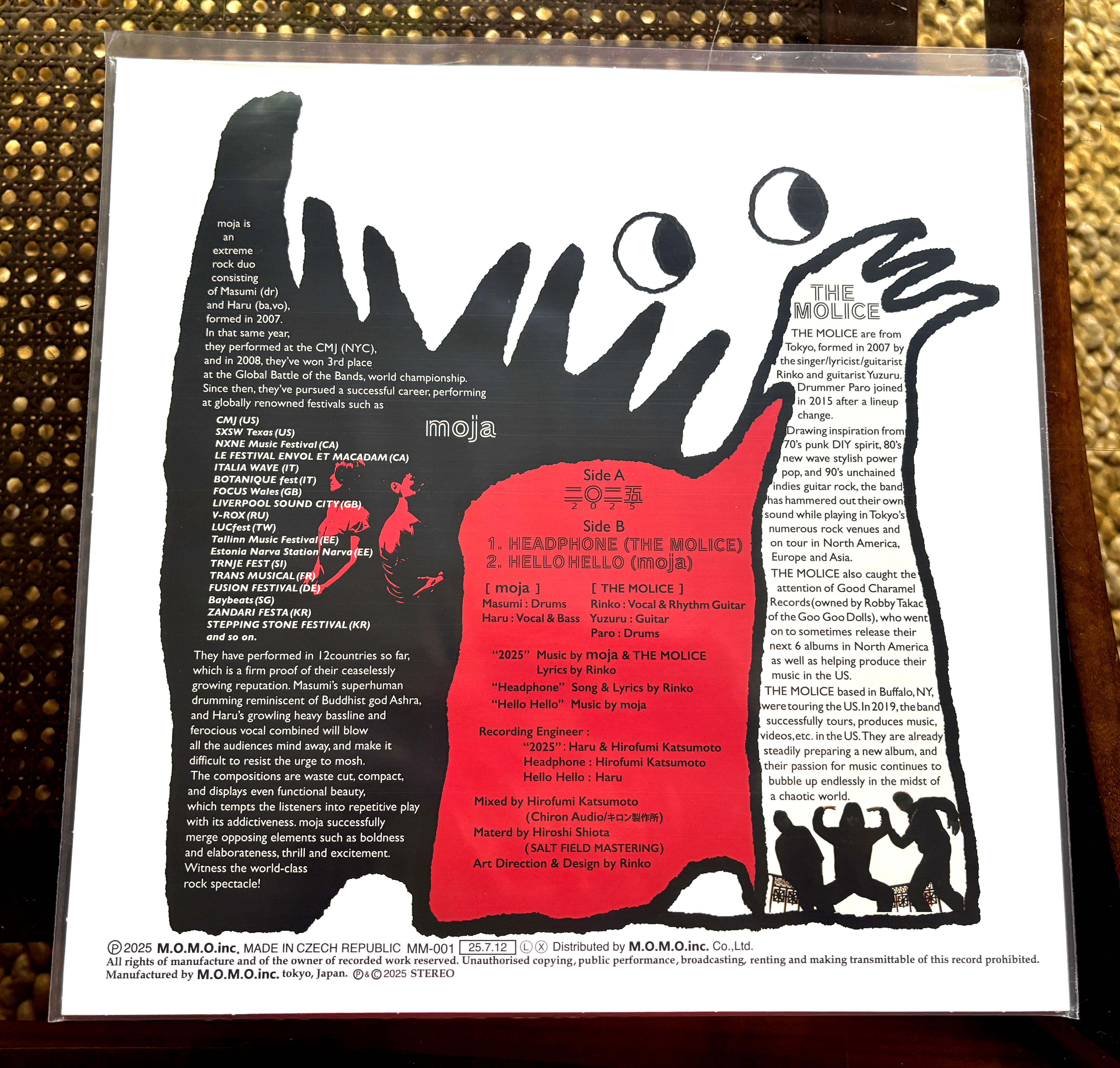 ・A面はTHE MOLICEとmojaが初めて一緒にスタジオに入り、音を合わせたインプロヴィゼーション楽曲。一生に一度しかできない貴重な曲です。
